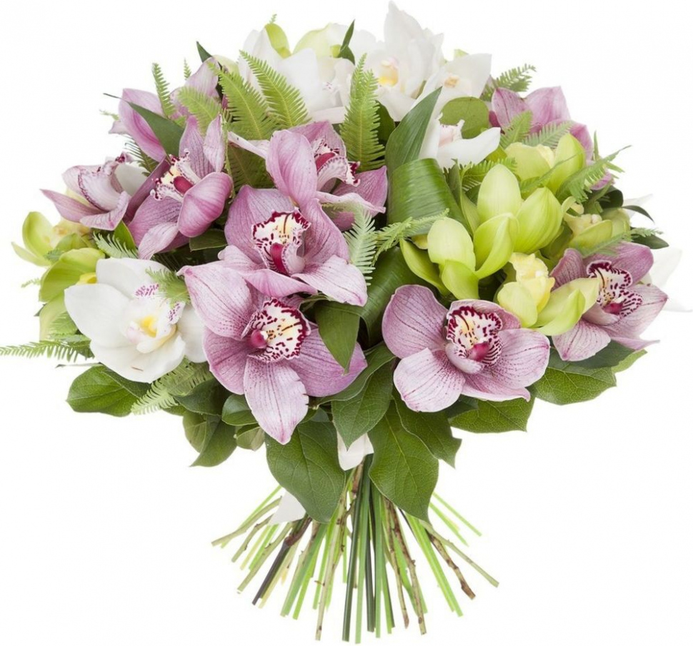 Букет из изысканных и трогательных розовых, белых и зеленых орхидей цимбидиум - это букет символизирующий чистоту и гармонию, искреннюю и нежную любовь и умиротворение. Такой букет дарят любимым людям, как признание в искренних чувствах, с ним приходит в жизнь романтичность, взаимная  любовь, счастье и удача.